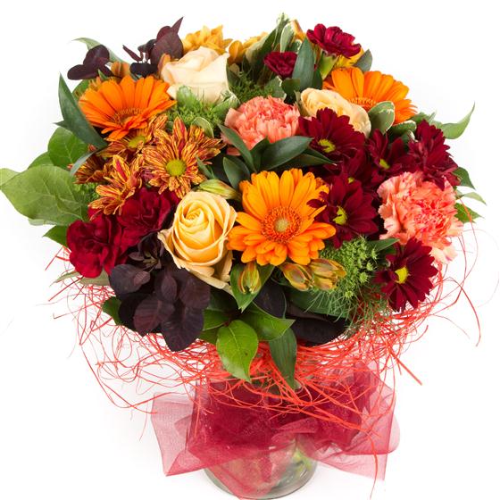 A delightful, compact bouquet of autumnal orange, red, and rust flowers in a sisal wrap (sisal wrap